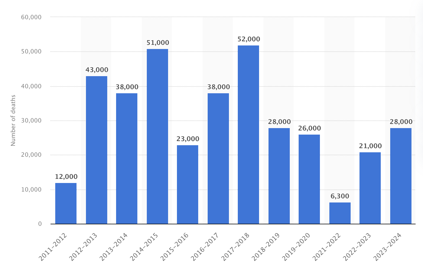 Figure 1. Flu deaths by year. The outlier (2020-1) is due to COVID restrictions. Source: Statista