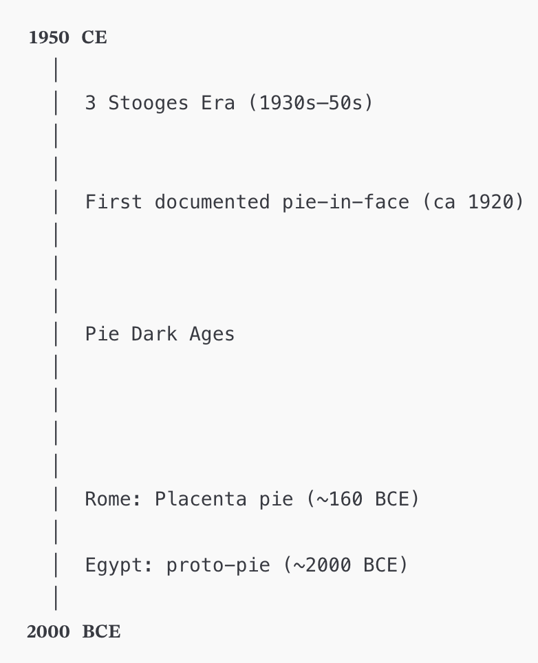 As shown below on the timeline, pie can be traced back to Egyptian times, where it did not look like Mrs. Smith's (or Mrs. Smith either). The thing was reportedly made of rough barley dough, fig paste, goat fat, and optimism.