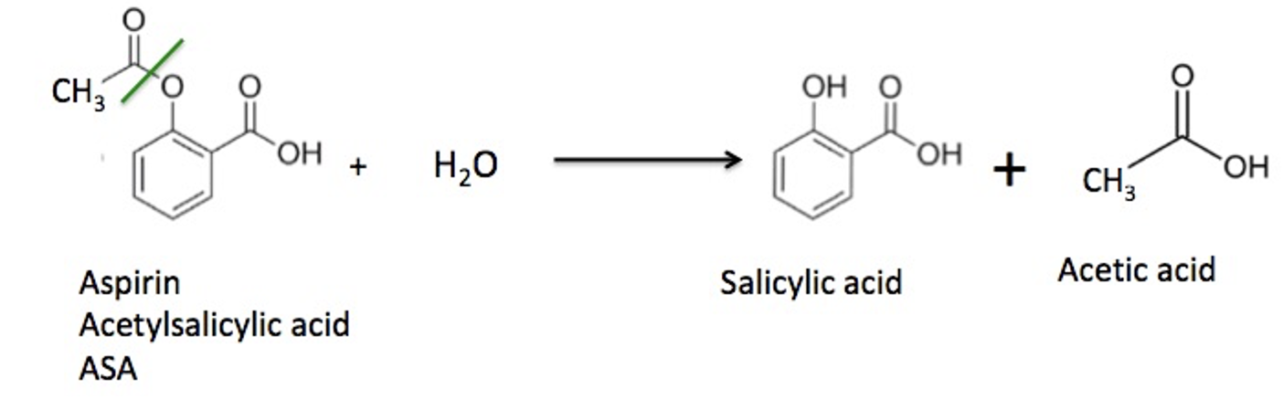 Figure 2. The reaction of aspirin with water to form salicylic acid and acetic acid. The green line shows the ester bond that is broken during the hydrolysis reaction.