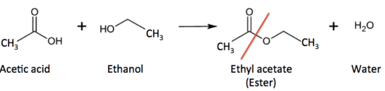 Figure 1. Acetic acid (a carboxylic acid) reacts with ethanol (an alcohol) to form ethyl acetate (an ester) and water. The red line shows the new ester bond.