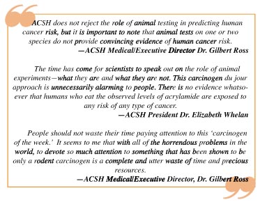 In a nation where food scares often play out like a comedy of errors, ACSH was quick to respond to an April news story about Swedish scientists' findings that fried or baked foods high in starch contain chemicals which can increase the risk of cancer in humans. Renouncing the cancer scare in an April 25 press release, ACSH noted that the claim that acrylamide, found in common foods such as potatoes and bread after cooking, poses a human cancer risk is based exclusively on high dose studies in laboratory animals. ACSH added that there is no evidence that humans who eat the observed levels of acrylamide are exposed to any risk of any type of cancer. The ACSH release also urged consumers to be skeptical of the unpublished findings, which assume that cancer rates in high-dose animal ingestion studies are a good indicator for human cancer risk.