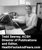 In January, Todd Seavey joined the ACSH staff as the new director of publications and editor of ACSH's new online magazine, HealthFacts AndFears.com. Mr. Seavey is a 1991 graduate of Brown University and has an impressive line of credentials in research and journalism. He has written freelance articles for the New York Press, the New York Post, Reason, People, Spy, and other publications, as well as scripts for Justice League of America comic books. You can enjoy his prolific and often controversial opinions in the "Editor's Rants" section of HealthFactsAndFears.com where he speaks out strongly on a wide range of issues and concerns. Mr. Seavey was also a researcher and associate producer at ABC News, where he worked closely with John Stossel.