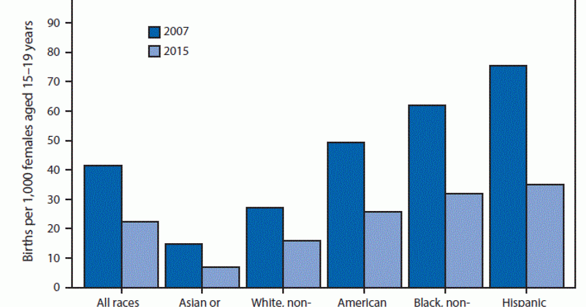Source: Brady E. Hamilton. "QuickStats: Birth Rates Among Teens Aged 15–19 Years, by Race/Hispanic Ethnicity — National Vital Statistics System, United States, 2007 and 2015." MMWR 65 (32): 832. DOI: http://dx.doi.org/10.15585/mmwr.mm6532a6.