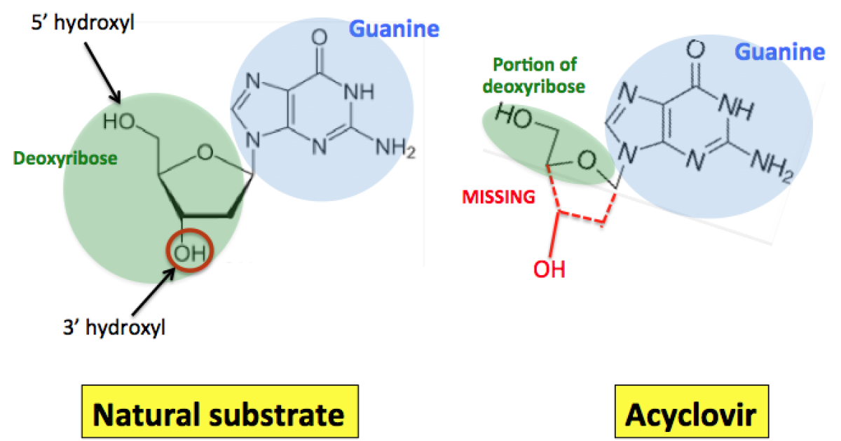 If enzymes had the capacity to experience regret, DNA polymerase would do just that at this point. Because once it incorporates acyclovir into the growing DNA chain, it is toast. It can no longer do its job. Note the difference between when 1) Normal elongation: another base is attached to the 3' hydroxyl group (left), which results in the addition of one more piece being added to the growing chain, and 2) Chain termination (right), when there is no place for the next piece to be attached, so the chain cannot grow. The new bond that is formed is represented by an orange dashed line, and the new base is inside the orange circle.