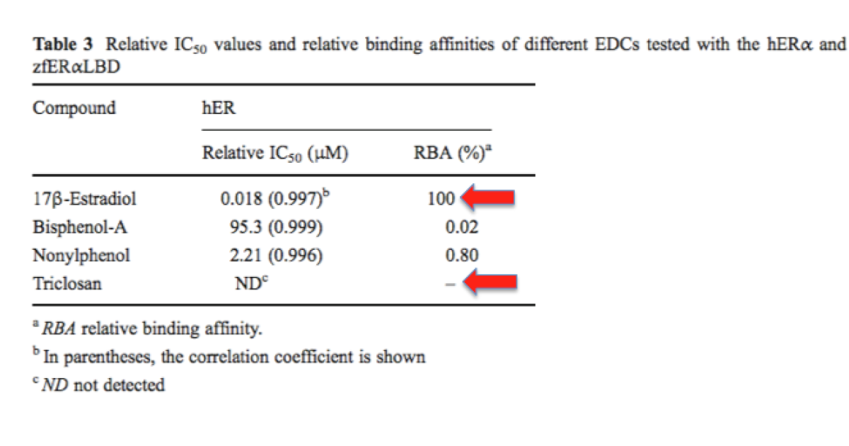 In the above table, three chemicals are compared to 17-ß-estradiol (one of the endogenous sex hormones) in an assay that measures relative binding affinities. On the left, 17-ß-estradiol's binding affinity for a human estrogen receptor is compared to that of three common chemicals: triclosan plus two other common substances. One of them is the "dreaded" BPA. In this assay, BPA binds 5,000-times more weakly than estradiol. But at least it can be measured. Triclosan has such a weak affinity for the receptor that no binding could even be measured so the chances of it affecting your sexual development (or anything else) are approximately zero.
