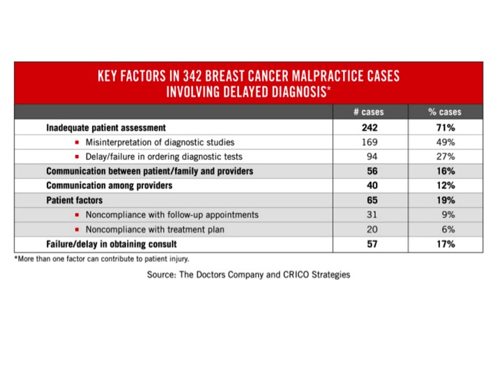 it is clear that mammography is limiting, especially in the case of a woman with dense breasts. However, the field is not responding quickly enough to this ongoing concern. A recent report put out by The Doctors Company illustrates the importance of clarifying this issue in the field of breast cancer diagnostics. They analyzed 562 breast cancer medical malpractice claims from 2009 to 2014 in the CRICO Strategies Comparative Benchmark System (CBS) - the medical malpractice insurer of the Harvard medical school community. In doing this, they found 342 cases of breast cancer malpractice due to delayed diagnosis, and roughly half of the total 342 involved radiology, more specifically, inadequate patient assessment and/or misinterpretation of diagnostic studies.