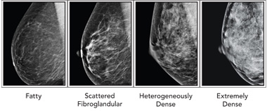 Although it is possible for some physicians to separate a very dense breast from a non-dense breast by a physical breast exam, the level of density is not possible to feel by touch. For that, physicians rely on mammography. Radiologists use a four category classification scheme when assessing the breast tissue on a mammogram called the Breast Imaging Reporting and Data System (BI-RADS).