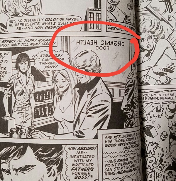 This is Iron Man #64 from 1973. It being backwards made sense because organic food was primarily for anti-science hippies in dense cities back then. While that is still true, trade reps have also successfully spun the hoary work of their clients into health halos and ethical gold. Credit: Disney