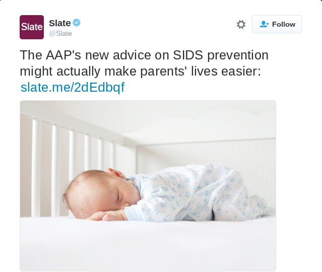 Note: Slate has since changed their photo associated with their coverage of the SIDS recommendations to one that portrays a safe sleeping environment.