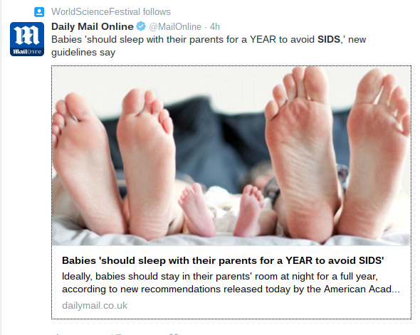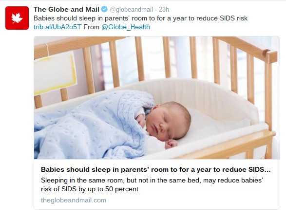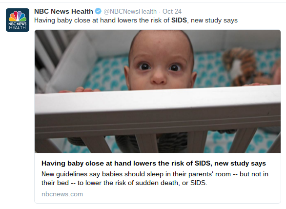 First of all, the majority of news organizations led with a new recommendation that infants should share a room with their parents for a year. Yes - this was a new recommendation and one that, perhaps, will probably generate interest with new parents. However, the report has a total of 19 recommendations all of which are important to work towards the goal of creating a safe sleeping environment. For all of the news outlets to lead with the same one leaves the other 18 unnoticed. What about not smoking, using a pacifier, immunizations, firm sleep surfaces, etc.?