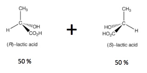 To distinguish one enantiomer from another one is called the "R" form, the other the "S" form. The "S" is why the generic name for Nexium is Esomeprazole. It is simply Prilosec with the "R" form removed. Most asymmetric chemicals are a 50-50 mixture of R and S (6). This is called a racemate (or racemic mixture). A simple example is a 50-50 mixture of R- and S-lactic acid lactic acid: