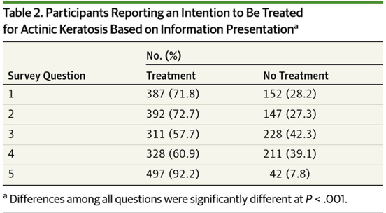 “Overall, this study shows that wording of information about AK is more significant in patient decision making than his or her age, sex, history of skin cancer, or history of AK” [level of education was only significant for a subset of patients] … it is still essential … that clinicians understand the impact of how they deliver information on patient’s decision making.”