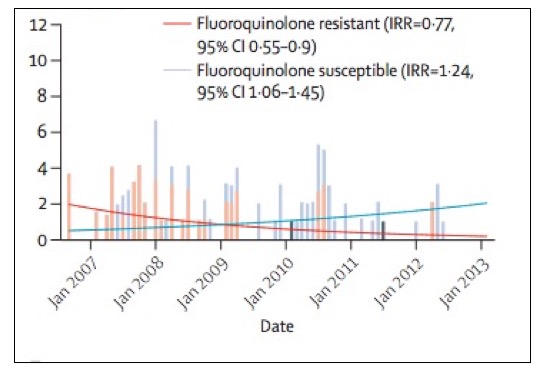 While all of these factors have played a part in the emergence of resistant bacteria, the relative importance of each factor is not clear. The British study, which was just published in The Lancet shed some light on the cause of a 2006 outbreak of the dangerous superbug— drug resistant C. diff. in the UK. The culprit in this outbreak was the use (or overuse) of a class of antibiotics called fluoroquinolones (2). This can be seen in the graph below.