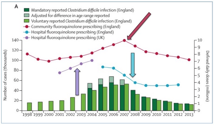 Note that in the seven years following 2006—the year that fluoroquinolone national control policies were instituted in Britain— that a reduction of hospital prescriptions of fluoroquinolones resulted in an 80 percent drop in C. diff. cases. But, this drop could also be explained by (or entirely due) to improved hygiene in hospitals.The authors considered two possible scenarios that would account for the decrease: