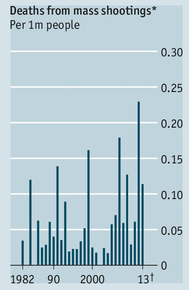 According to a 2013 analysis provided by The Economist (see chart on right), the worst year for mass shootings (based on morality rate and defined as "four or more people killed in a single incident and location") in the U.S. was 2012, with a mortality rate just under 0.25 deaths per one million. In other words, the average American is roughly five times more likely to die from accidental carbon monoxide poisoning than in a mass shooting.