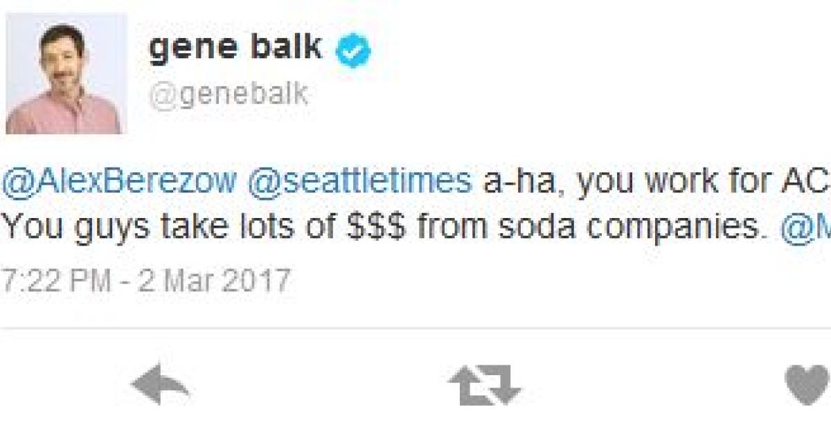 2. A few days later, a writer at Seattle Times named Gene Balk used the exact same verbiage as in the organic corporation press release ("industry front group") when responding to criticisms about his claim that the lack of a tax on diet soda was racist