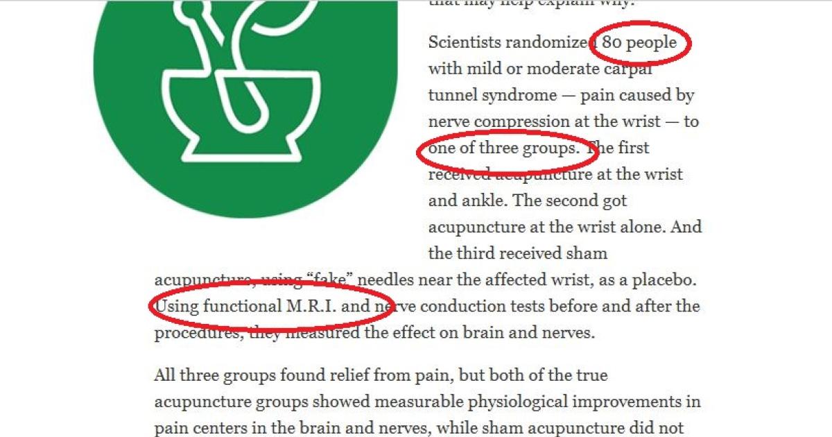 Compare that to corporate media, who love weak observational claims, the bolder and more ridiculous the better. It gets them attention, and that attention makes scientists want to appeal to corporate media like the New York Times writers because an appearance in the science section lends a veneer of credibility the same way appearing in Nature does. While Mother Jones writers will bow obsequiously to the name Harvard, Harvard is now bragging their acupuncture claim has been validated by the New York Times. Next, lots of woo sites selling acupuncture and other alternative facts about health will use that appearance in NYT to claim legitimacy.
