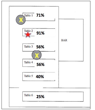 Adapted from Epidemiology and Infection. The women who vomited was at the table with the red star. The yellow X represents ceiling fans, which probably didn't help matters.
