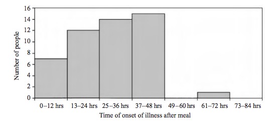 About 36 hours later—the typical time from exposure to onset of symptoms—a party organizer called the South Derbyshire Health Authority (3) to report that she was aware of 9 members of her party who were vomiting or had diarrhea. By the end of day three following the dinner, 56 of the 126 people at the dinner (44 percent) had caught the virus from the ill woman.