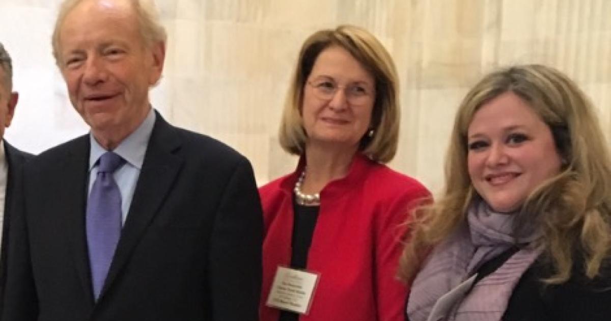 Senator Joseph Lieberman, a longstanding supporter of CEE, presented his namesake award to Dr. Lauren Ancel Meyers, Professor of Integrative Biology at the University of Texas at Austin. In his introductory words, he recalled the scene from the famous film “The Graduate” where the movie character proclaims “The future is plastics” and substituted the word “algorithms” in recognition of Dr. Meyer’s many contributions to public health via her expertise in mathematical biology. He spoke of the immense pride her mother— who accompanied her to the award ceremony— must have in her innumerable accomplishments and told some humorous anecdotes of his own supportive mother.
