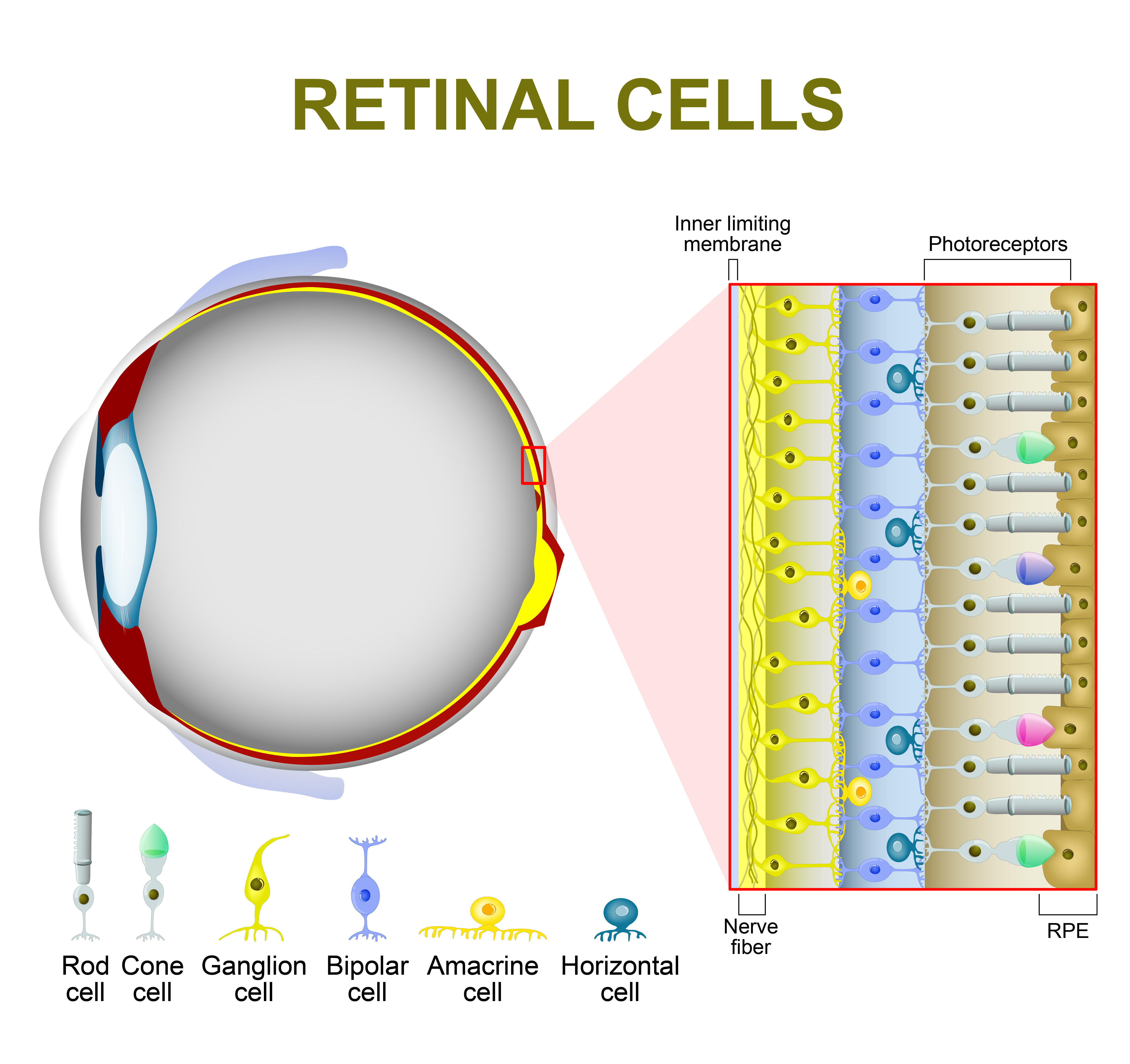 The retinal ganglion cells are unlike the others in the retina. Those – called "cone cells" and "rod cells" – are responsible for transmitting signals about imaging and what the eye is actually focused on.