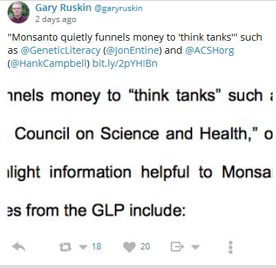 To add to the prestige, legendary anti-science activist Gary Ruskin has personally singled me out as being the reason that he has not had more success convincing people they should in a panic about food that he is not paid to endorse.