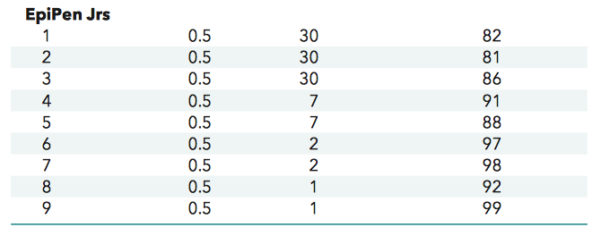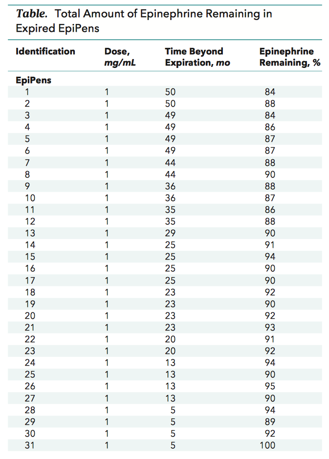 Mr. Cantrell and his team tested 40 EpiPens in all (including nine EpiPen Jrs) that had exceeded their expiration dates, ranging from 1 month to 50 months past the stamped date. As shown in the accompnying tables (courtesy: Cantrell study) all but two were at least 84 percent potent with sufficient concentrations of epinephrine to be considered effective in preventing anaphylactic shock.