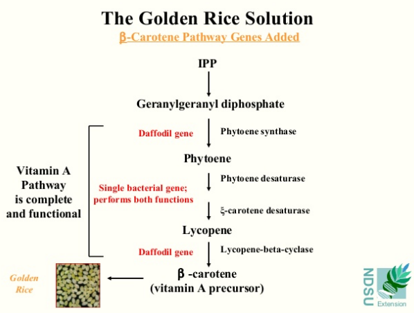 These academic scientists found that in order to give Golden Rice the ability to make beta-carotene, three genes needed to be added to the embryo of the rice. Two of the genes come from daffodil and one from the bacterium Erwinia uredovora. The genes produce proteins that convert the precursor, IPP to beta-carotene. (The pathway is detailed in the adjacent graphic, courtesy North Dakota State University.)
