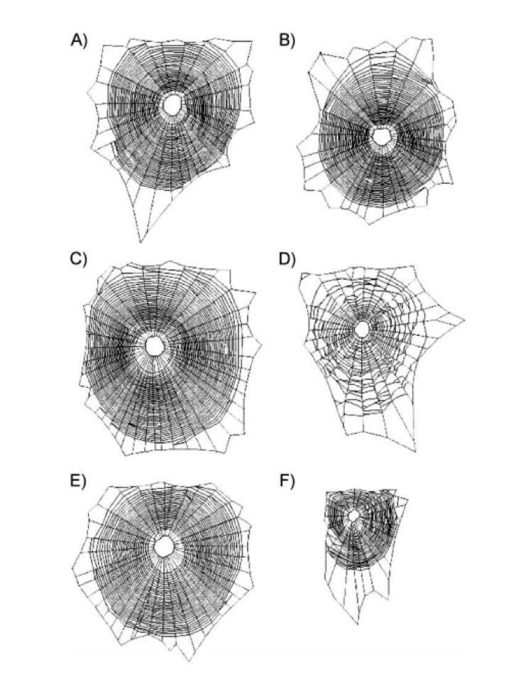 This same type of experiment has since been repeated and peer reviewed. One example is an article entitled, "The Effects of Neurotoxins on web-geometry and web-building behaviour in Araneus diadematus." In this paper, they analyze spider webs to define web building as a behavioral pattern that can be used to test the effect of neurotoxins. In the below figure, A) and B) are before and after the administration of a control solution, C) and D) are before and after administration of amphetamine, E) and F) are before and after the administration of caffeine.