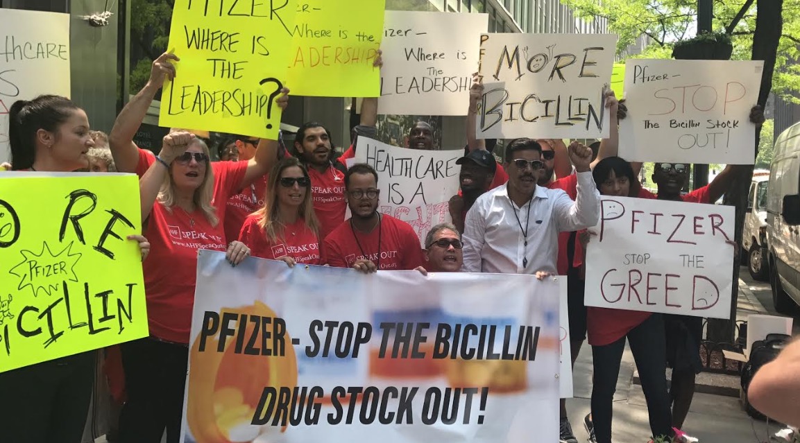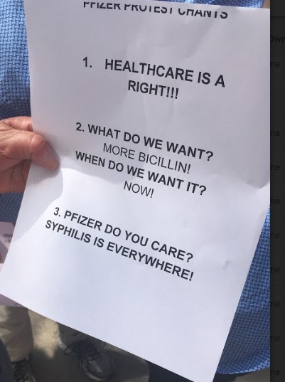 Untreated syphilis can create a host of health problems; these can be severe, for example, damage to the brain, nerves, eyes, heart, blood vessels, and liver. It can sometimes cause blindness, mental illness, and even death. But, perhaps the biggest threat of the infection is to the unborn children of pregnant women. Fetuses of mothers who are infected with the bacterium are at a particularly high risk. The infection can result in stillbirth, death after birth, and low birth weight, and serious developmental disabilities. This is not an infection you want your child to catch. So, it is no surprise that the shortage of Bicillin is very disturbing to pregnant women who are infected. This, at least on the surface, explains the protest that took place in front of Pfizer headquarters on May 19th. A group called the AIDS Healthcare Foundation was out in force demanding, among other things that: