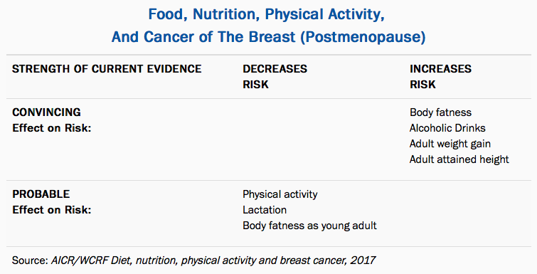 This report mainly addressed risks connected to lifestyle, but it should also be reiterated that there are established indicators for breast cancer, with family history being one of the most prominent. Others are having experienced an early menstrual period, and the lack of experiencing full-term pregnancies.