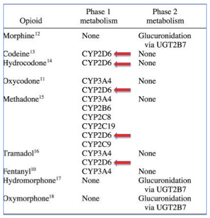 Source: Mayo Clin Proc. 2009 Jul; 84(7): 613–624. Note that CYP2D6 is responsible for the metabolism of most opioids.