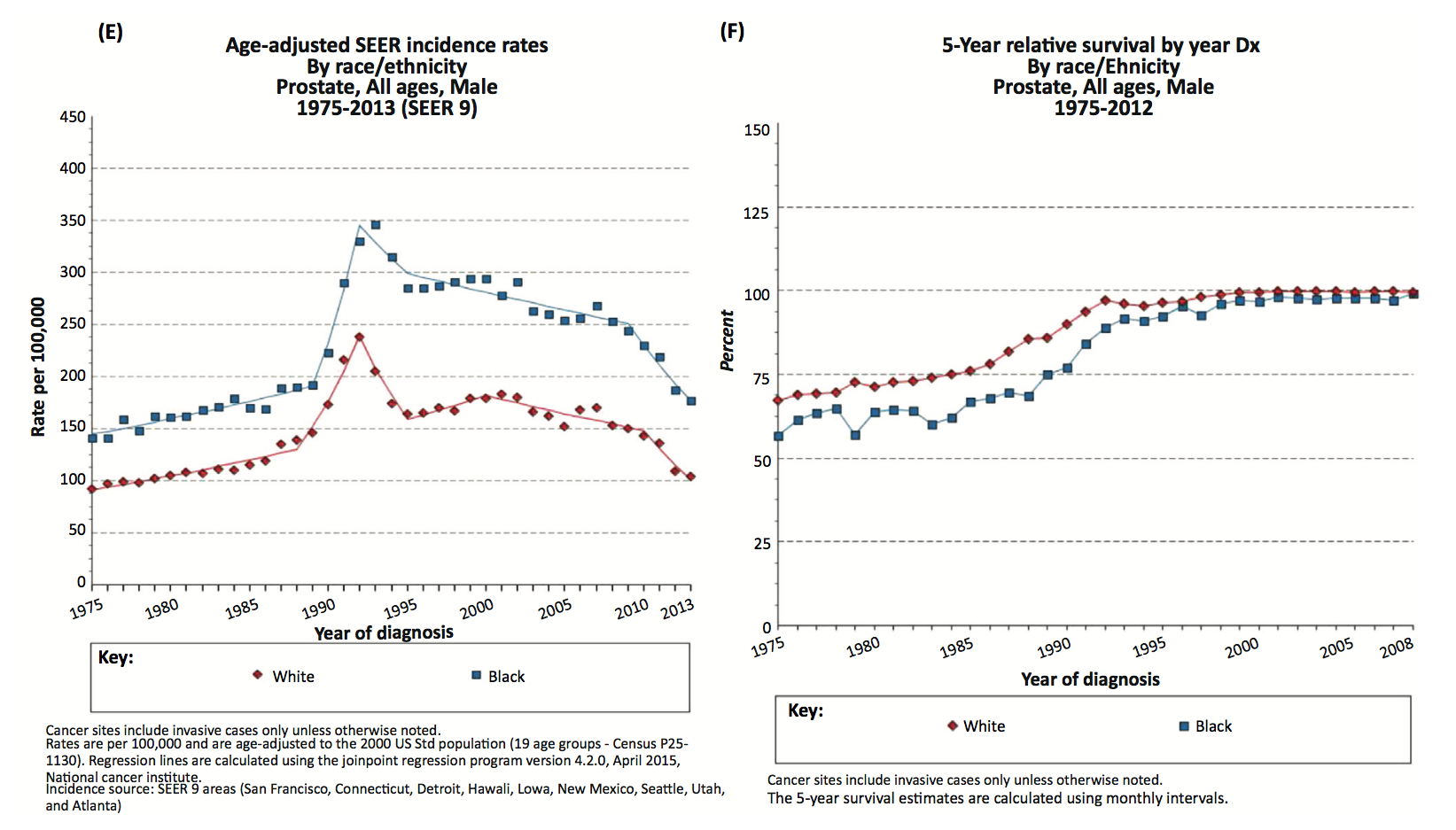 A particularly compelling argument compares the incidence of prostate cancer (i.e., the number of new cases) among white and black men with five-year survival rates. Today, both white and black men have roughly the same outcome (nearly 100% survival five years after diagnosis), but black men are far more likely to be diagnosed with the disease in the first place. This strongly suggests that, for prostate cancer at least, something other than healthcare access is causing the higher rate of cancer.