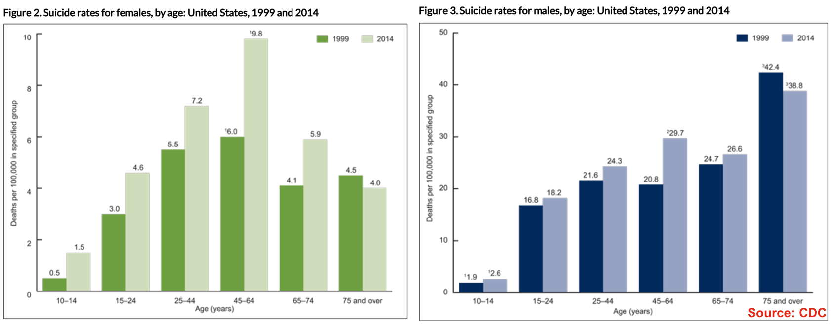 New data released by the CDC highlights the hardship of modern teenage life. Since 2007, the suicide rate among boys aged 15 to 19 has increased by 31% (from 10.8 to 14.2 per 100,000), while the suicide rate among girls has more than doubled (from 2.4 to 5.1 per 100,000). In fact, the suicide rate for teenage girls is at a 40-year high*.