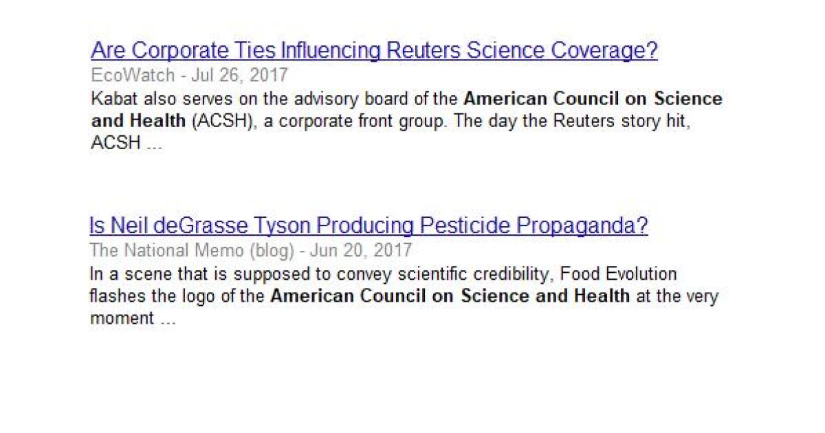 1. On Science Codex, a take on how anti-science groups who are all working together, and even funded by the same groups, such as Organic Consumers Association and its vassal sites like Sourcewatch and US Right To Know, mobilize its bloggers for their clients. In this case they allege that Dr. Geoffrey Kabat, an advisor here who is an epidemiologist at Albert Einstein College of Medicine, and Dr. Neil deGrasse Tyson, who directs the Hayden Planetarium at the American Museum of Natural History and hosts numerous science programs, plus the entire Reuters organization are all part of the same vast corporate pro-science conspiracy. But it's just one person astroturf'ing this fairy tales on lots of sites. Their paid blogger doesn't even bother to change the words, because Ecowatch, National Memo, Huffington Post, etc. really don't care.