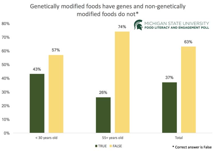 Overall, 37 percent of respondents thought the above statement was true. In fact, except for purified products derived from plants, such as sugar and oils, all foods contain genes, of course, as does every living cell in the world. Good luck finding one that doesn't. Older folks seemed to be considerably more savvy about this basic fact.