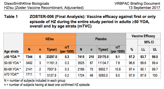 The panel, formally known as the Vaccines and Related Biological Products Advisory Committee, agreed with GSK's contention that its vaccine was an improvement over Zostavax, Merck's vaccine that was approved in 2006. While the efficacy of Zostavax falters over time, GSK said, Shingrix (also known as HZ/su) has greater staying power and it can protect a wider range of older adults, as the table indicates.