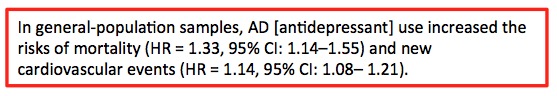 (2) The theory about cardioprotective effects of antidepressants is nothing but speculation. And also baseless. A Cochrane review makes this clear: "No beneficial effects on the reduction of mortality rates and cardiac events were found [in patients with heart disease who took antidepressants]. Overall, however, the evidence is sparse due to the low number of high-quality trials per outcome and the heterogeneity of examined populations and interventions."