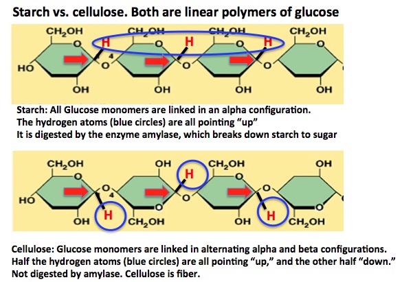 Starch and cellulose are almost chemically identical. Both are long polymers consisting of repeating glucose units. But there is a subtle but important difference between the two, and it has to do with how the glucose units are bonded together. Glucose molecules can be attached to each other in one of two ways. (The red arrows indicate the carbon where the attachment takes place. It is called the anomeric carbon.) One type of bonding is called the alpha configuration, where the hydrogen atoms (blue oval) at the anomeric carbon are all pointed in the same direction - "up." In starch, all of the individual glucose molecules are bound to each other in the alpha configuration.