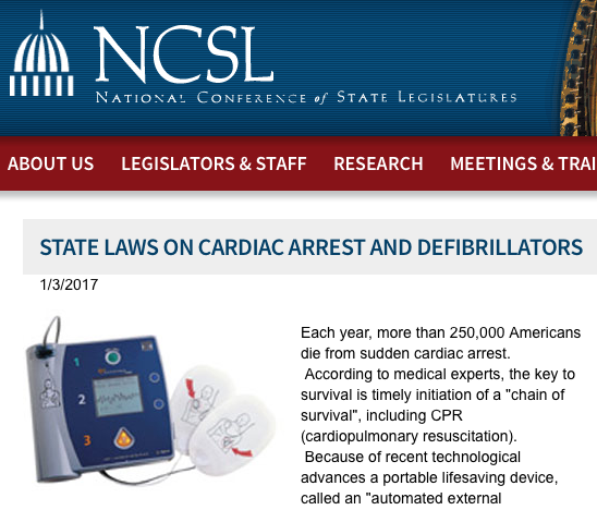 A good place to start is with the National Conference of State Legislatures, and their website page "State Laws on Cardiac Arrest and Defibrillators," which was updated in January. It contains links to all the states and the District of Columbia, which detail the extent of coverage. There are also links to third-party sites like this one with additional information on AED-Good Samaritan Laws.