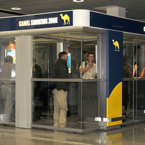 One amusing aspect of Europe's smoking culture is the prevalence of designated smoking areas in international airports. These are far less common in American and Canadian airports, which tend to ban smoking outright. In Europe and Asia, however, a smoker's gotta smoke -- so they are accommodated. At oases scattered around the airport, smokers pathetically cram into tiny, smelly rooms to get their nicotine fix.