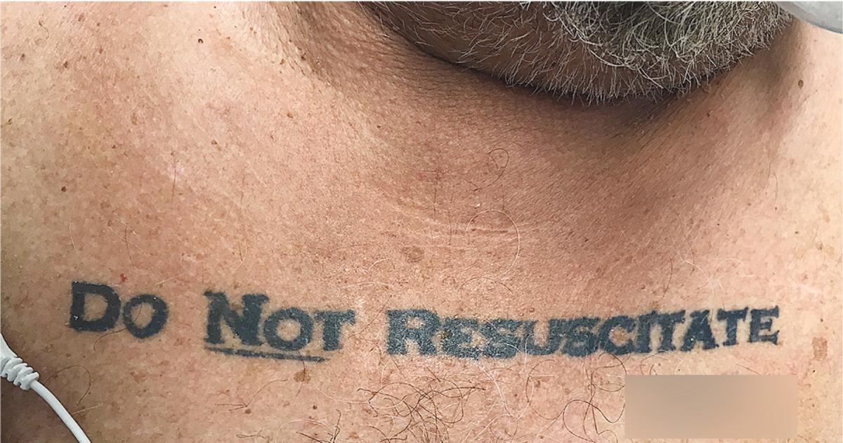 The conflict, as you surely have determined, stems from the tattoo near his collarbone that read in dark, block letters "DO NOT RESUSCITATE," which even included the man's signature below it. The unique directive was characterized by the doctors as an "extraordinary effort to make his presumed advance directive known," according to the letter, written by the attending physicians providing details of the extraordinary case.