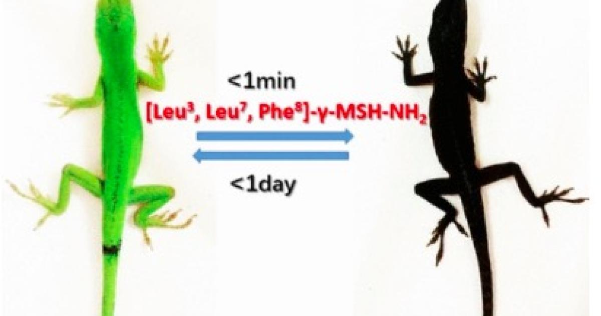 No, what you see in Figure 1 is not a PowerPoint slide for a sensitivity training course. It's far more interesting (1). Make that fascinating. Instead, it is two photos of the same lizard taken 24 hours apart. When an experimental peptide (2) drug is given to a green lizard it turns black within one minute and stays black for about a day. Incredible. And also about as good a demonstration as you'll ever see of chemistry, biochemistry, and biology working together.