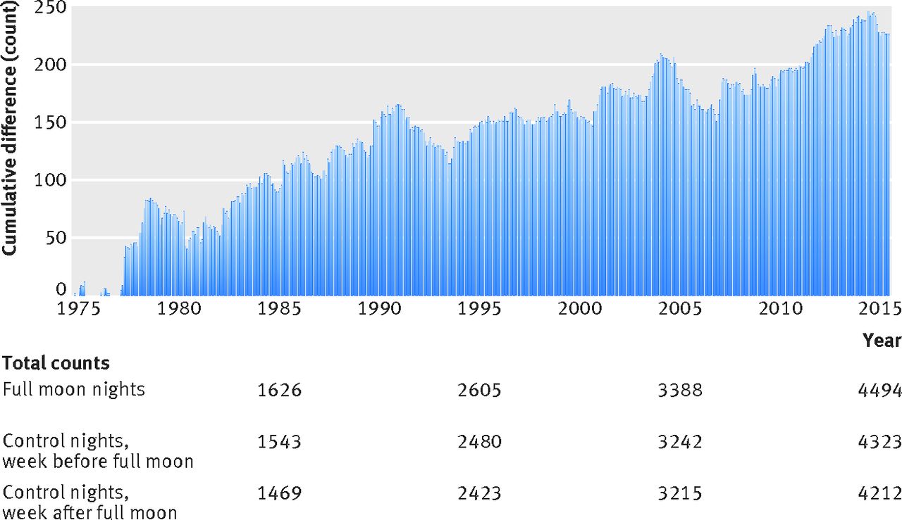 At just over 12 full moons per calendar year (given they occur every 29.5 days, or more than once per month), researchers counted 494 full moons over the 40-year study period, and 4,494 fatal accidents that occurred on those nights. By comparison, establishing two controls, they also tallied the number of fatal crashes taking place exactly one week before the full moon and one week after, arriving at 8,535. As such there were twice as many control nights as full moon nights, or 988.