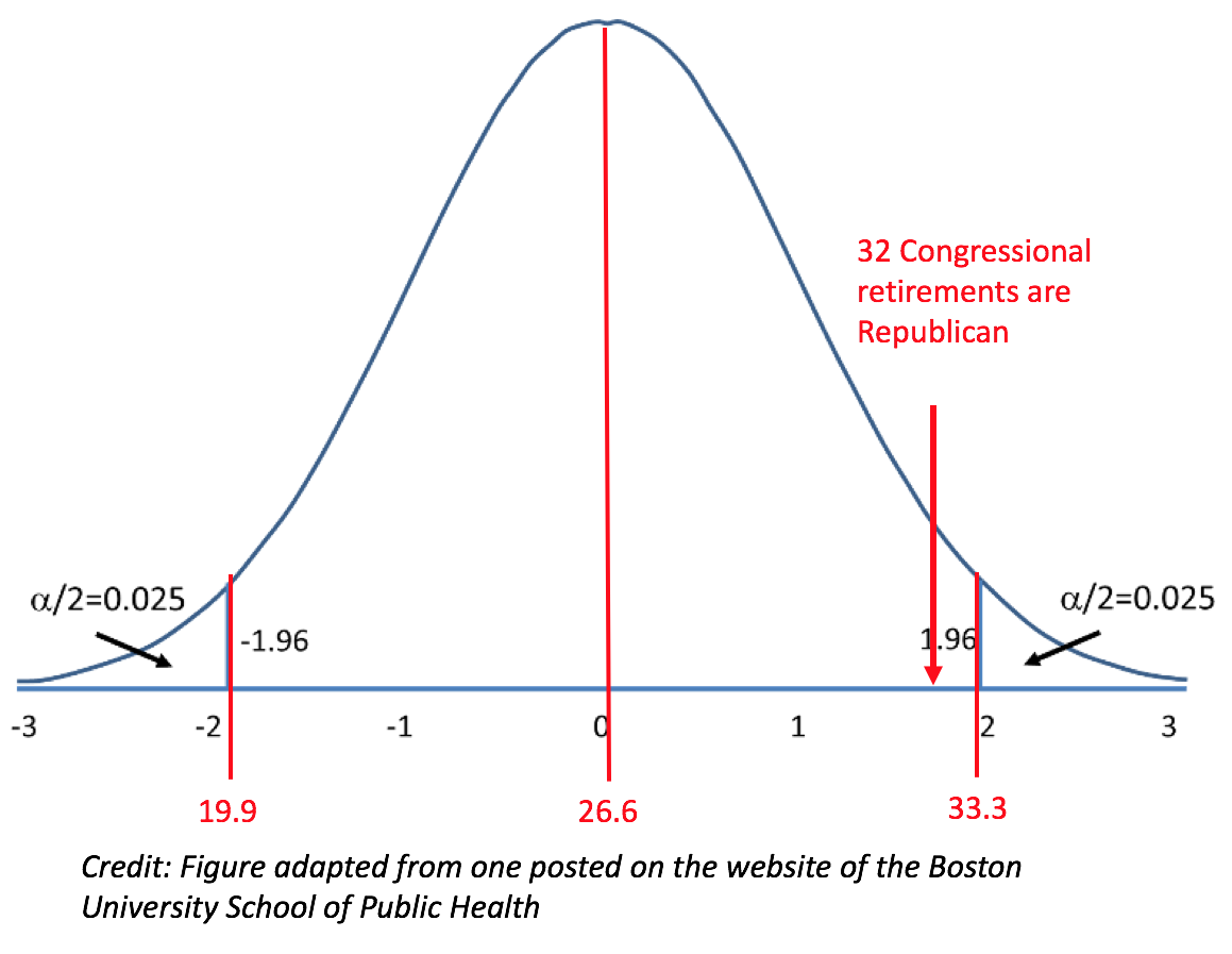 We can examine the test of proportions graphically. (See below.) Given that 48 Congressmen are retiring and 55.4% of Congressmen are Republican, the "expected" number of Republican retirements is 26.6. However, the statistics also show that the range (given 95% confidence)3 could be anywhere from about 19.9 to 33.3. In other words, if fewer than 20 Republicans retired, that would be considered abnormally low; if 34 or more Republicans retired, that would be considered abnormally high.