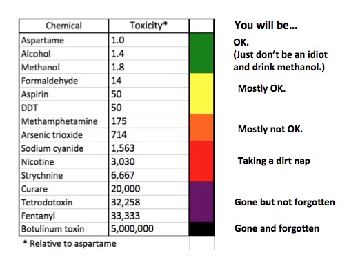 Table 2 (below) contains a random group of well-known chemicals, both naturally occurring and synthetic. The toxicity (LD50), either in rats or mice, was determined by administration of a single oral dose of the chemical. The safest chemical I chose (and one of the safest anyone could choose) was (aspartame, LD50 = 10,000 mg/kg) and assigned a value of 1.0. The other chemicals were ranked by comparison to aspartame. (2)