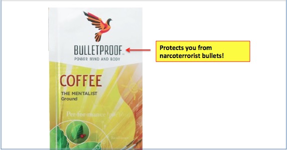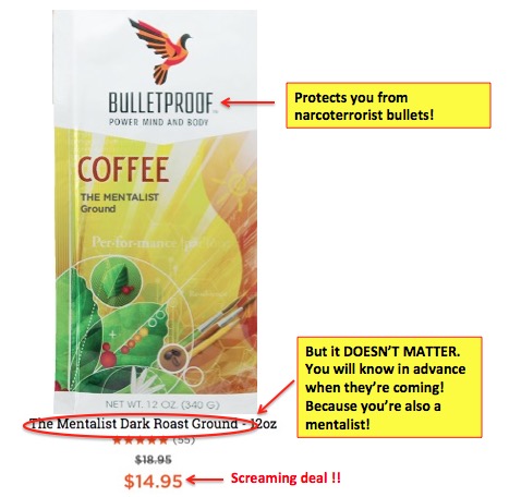 Well, this sure seems too good to be true. Not only will this coffee protect you from AK-47 bullets, but you will know about the attack well in advance - perhaps before it is even conceived. Because you'll be a mentalist too!