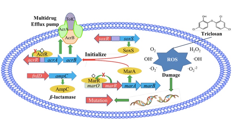 TCS causes something called oxidative stress on the bacteria that are exposed to it. This stress, in turn, results in genetic mutations in multiple genes. Some of those genes, such as fabI, frdD, marR, acrR and soxR, are involved in antibiotic resistance. Therefore, when the expression of these genes is changed, the result is the ramping up of such well known antibiotic resistance mechanisms in the cell such as beta-lactamase and multi-drug efflux pumps. The way this is thought to occur is illustrated in the model below. These findings suggest that the role of NAAM chemicals in increasing antibiotic resistance may be worse than originally thought.
