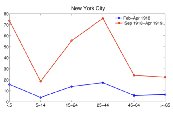 Once again, young people were hit particularly hard. The figure on the right shows excess mortality rates per 10,000 people in New York City from influenza in 1918. The early herald wave (blue line) was far less lethal than the autumn wave (red line). Note that people aged 15-44 were about two to three times likelier to die in the autumn wave (red line) than people aged 45 and older. This stands in stark contrast to seasonal influenza, which tends to kill older people.