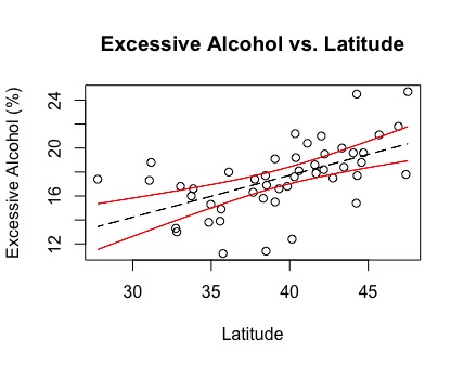 The graph to the right depicts the percentage of an American state's population that drinks excessively versus the state's average latitude2. Once again, the best-fit line is in black, and the confidence interval is in red.